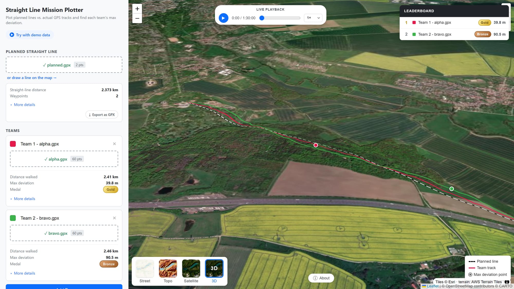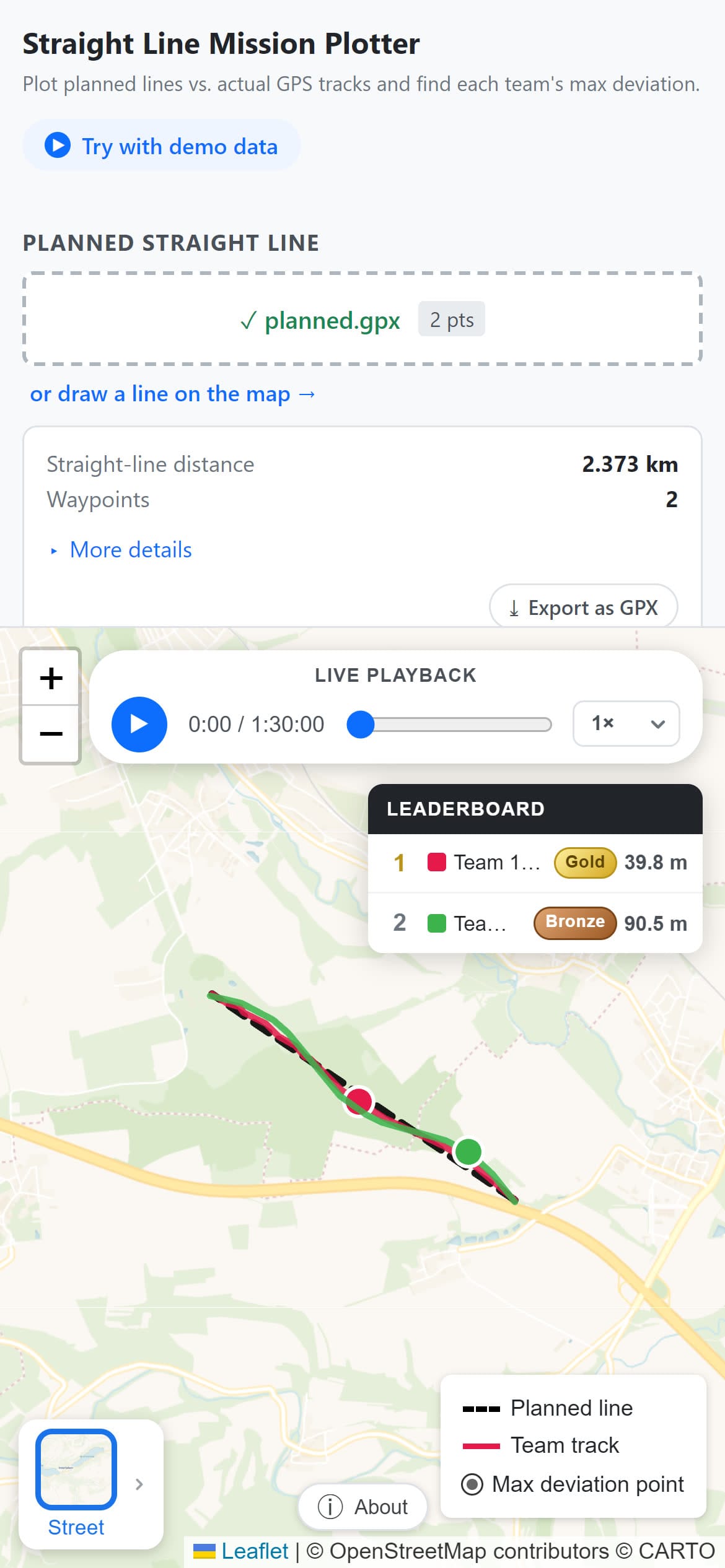 Die Anwendung läuft vollständig im Browser, ohne Installation, ohne Account und ohne Server. Man lädt die geplante Linie als GPX-Datei hoch oder zeichnet sie mit zwei Klicks direkt auf der Karte ein, fügt pro Team die jeweilige GPS-Aufzeichnung als GPX- oder Garmin-FIT-Datei hinzu, und sofort werden für jedes Team die maximale Abweichung berechnet und farblich auf der Karte hervorgehoben, automatisch Medaillen vergeben — Platin, Gold, Silber oder Bronze je nach Genauigkeit — und alle Teilnehmenden in einem Live-Leaderboard sortiert.